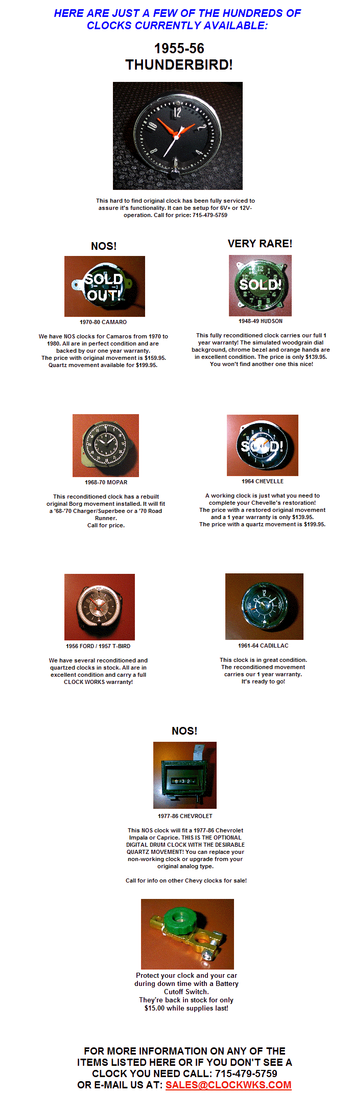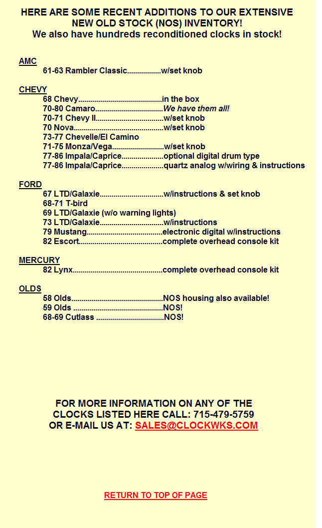 movements. We may have a clock for your car. Call: 715-479-5759.